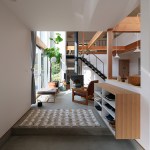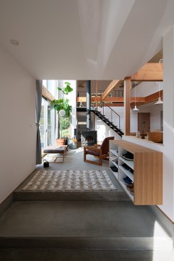 The lead architect Daisuke Kishina designs large windows to bring in daylight and fresh air while also providing with a strong connection to the exterior landscape. Rather than completely separates the private space, the border between the outside and the interior was created through a concrete space that japanese called “doma”.