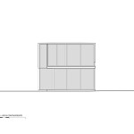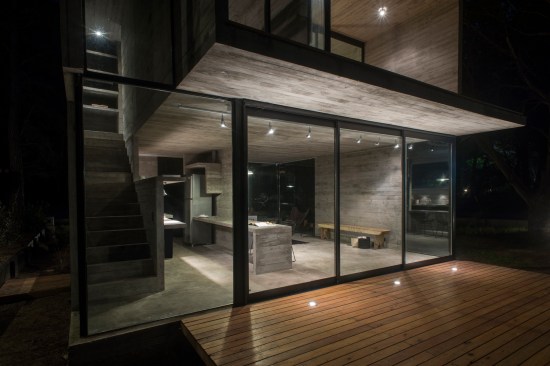 While the sidewalls are mainly blind, the front upstairs show the blind volume housing the bathroom and the high windows of the main bedroom, under which a storeroom lies inside. On the rear, floor-to-ceiling windows connect both windows with the outdoor deck they share.