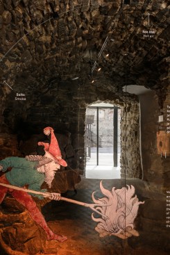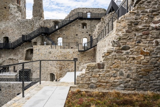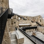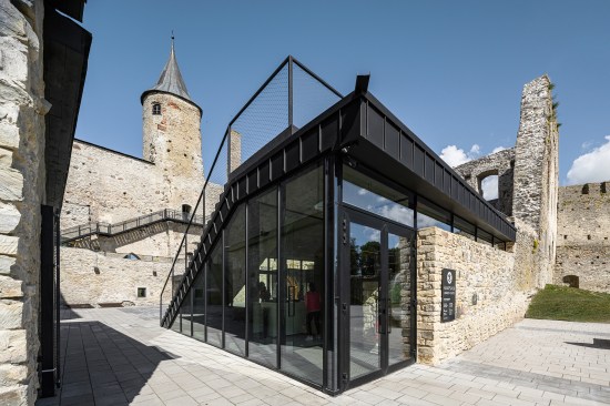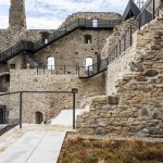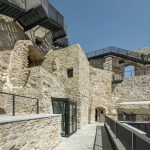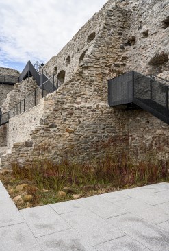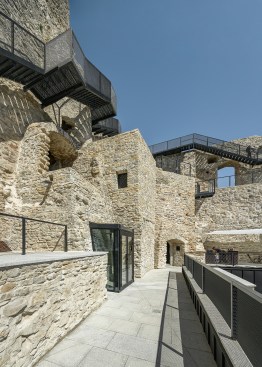 The pathway is like a flowing band, guiding the guest in a journey of impressions from the present and the past. Its bridge-like structure has been attached to the walls by means of steel cantilevers, which were placed so as to minimise any damage to the historical stonework. For example, we made use of wall parts that already had anchorage points for the roof structure, originating from the renovation in the 1990s, or attached the bridge to those parts that had already been reconstructed. For the bridge to be lightweight, the pathway was made of sheet steel.