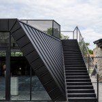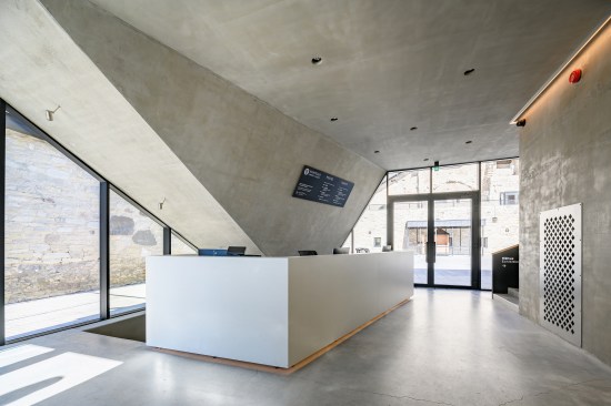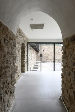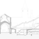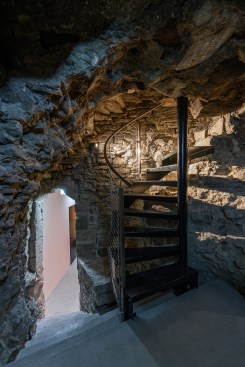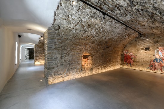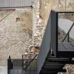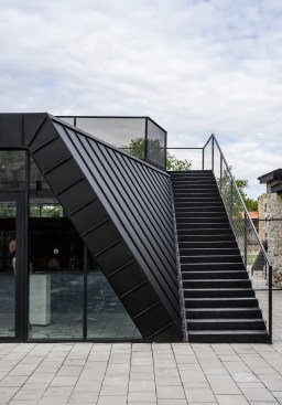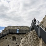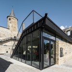 The new entrance pavilion is a homage to the historical castle and almost appears to be peeking out curiously from behind the wall. This solution is also spatially justified: it connects different levels, ensuring access to the basement, ground level and the roof, thus serving as the beginning and end point of the journey. The floor of the pavilion is level with the ground in the courtyard; the exhibition in the basement floor and the personnel rooms are connected by stairs. The pavilion has an open-plan design and is well-lighted and easily accessible. The building has two entrances, one right near the castle entrance and the other for guiding guests into the courtyard.