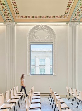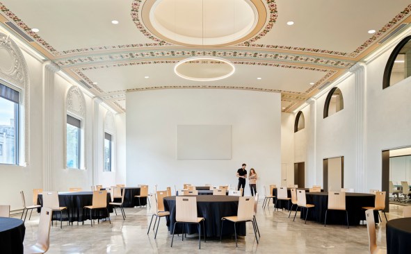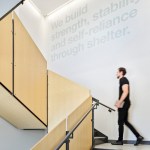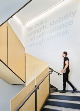 The design team aimed to support Habitat KC’s goals and bring the organization’s vision for the future to life through a renewed, healthy, and inspiring environment that enhances overall organizational function and effectiveness. Working within the existing structure, the renewed Habitat for Humanity of Kansas City office takes cues from the original design concept of the building, and celebrates its significant features such as the historic plaster work and the dome of the original sanctuary that now serve as focal points of the new community room. The building includes 31 private and open offices; a board meeting room; break area and community kitchen; mother’s room; building workshop; and a large, multi-functional community gathering space. The project supports and elevates Habitat KC’s work in helping families in the Kansas City community build strength, stability, and self-reliance through shelter.