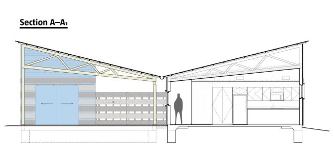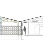 over an intimate enclosed courtyard, its half-scissor trusses and