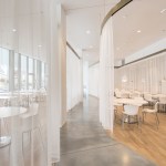 At the heart of each floor, we have combined user flows and all the other functions of the project in a single fluid space. The interior of the building is the polar opposite of a conventional corridor lined with a monotonous array of doors on either side. The unique floor plan allows for a variety of flow options, and consequently also a flexible and adaptable distribution of spaces between the group’s various publishing houses and imprints across each floor. The result is a generous communal space, punctuated by loggias and patios, that links together a series of different atmospheres, encapsulating the individual personalities of the different entities present.