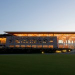 The Nine Bridges Country Club-Clubhouse is a 16,000-squaremeter facility that serves a golf course. It has an underground level and three floors above grade. There is a main building, VIP lobby building, and a structure with private suites. The atrium and the upper portion of the main building include timber columns and a glass curtain wall, while the base is made of stone (random rubble masonry typical of Korea). The timber area includes the reception zone, a member’s lounge, and a party room. The stone podium houses locker rooms, bathrooms, and service areas. The roof over the main building measures 36 x 72 meters. The unusual tree-like timber columns in the atrium reach to a height of three stories. The partial-timber structure was used to conform to Korean regulations that do not allow timber buildings to exceed 6 000 square meters in size. The first floor of the atrium has 4.5-meter-wide glass shutters that open fully.