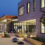 The courtyard is carefully oriented to provide protection from the wind, as the area can be chilly year-round. By blocking the wind with the massing of the building and using darker materials like black metal composite seats to trap the warmth of the sun, the courtyard is able to be a fully functional outdoor space, complete with an amphitheater for children’s story time.