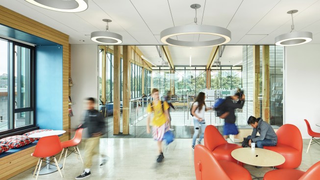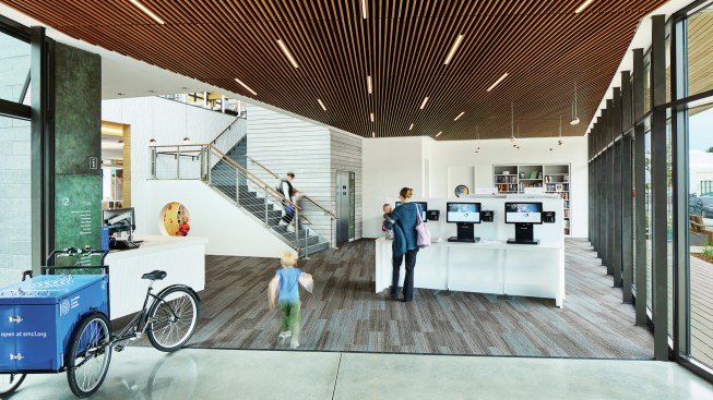 Playful 3Form plastic panels are used throughout the interior. The translucent white material is intended to evoke coastal fog, while the green and blue pops of color in places like the children’s area is meant to represent playful water droplets and sea glass.
