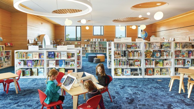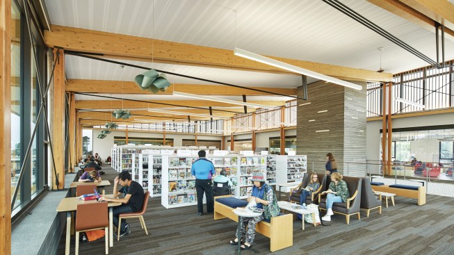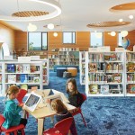 The highly flexible space can serve multiple functions as user needs change, while remaining connected through unifying design elements. For instance, although it is almost impossible to tell, three-quarters of the stacks are on wheels, giving the library the flexibility to change the layout of the room over time, or even for special events. The dynamic spaces are comfortable for all age groups, provide clear wayfinding, and incorporate a beautiful palette of colors and finishes.
