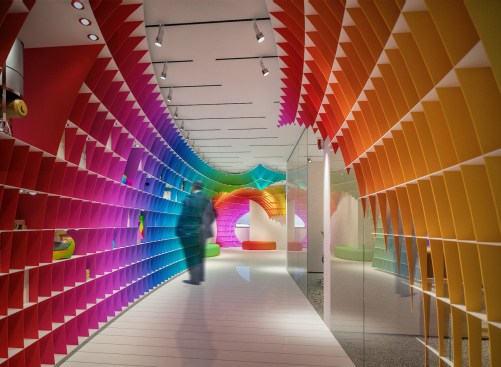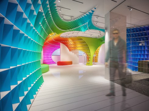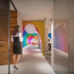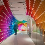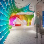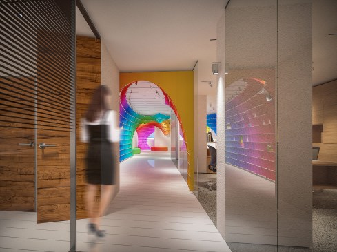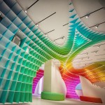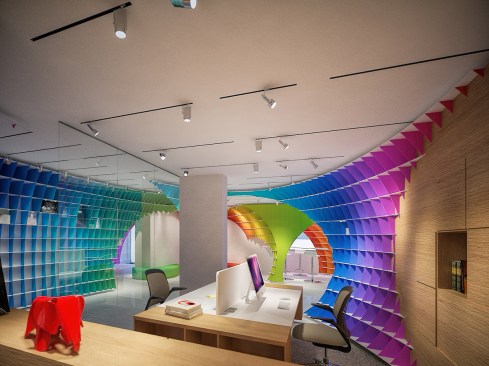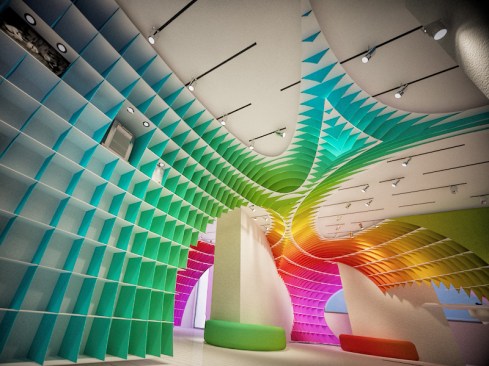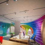 The initial idea of the showroom design realized for Halimoglu-fasarit paint company is constructed on the giant ”eggs” that are installed into the venues. Cross-sections which are created by eliptical paraboloids overhanging from the venue, with each other and with the venue itself , constitutes the main character of the design. The distinct difference which is seen between the showroom and the working spaces outside of it , ensures impressive appearance of the repetitive spinal column at the transitional areas. The color input coming from the paint origin of Halimoglu Company , is expressed by spreading a 3 dimensional rainbow into the venue.