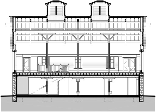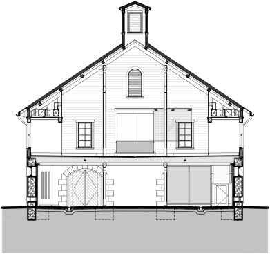 The architects’ intent was to leave new materials looking new so as to showcase what was preserved. In the end, the client’s desire to have a building that looked like it belonged to the era during which it was built prevailed and the new exterior wood on the upper level was aged.