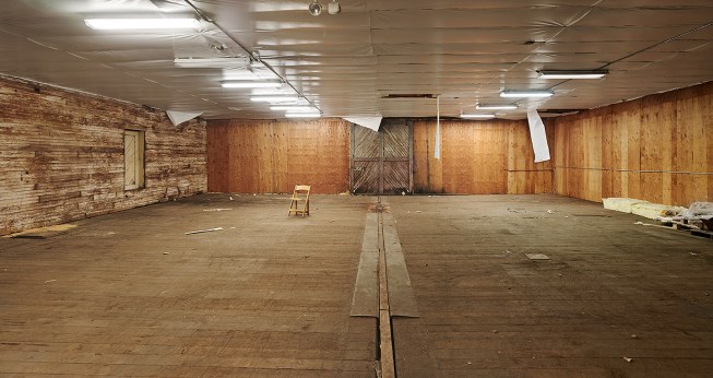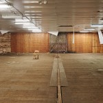 The original, upstairs floor, which consisted of two layers of wood laid perpendicular to each other, was preserved. The floor slopes to a center drain which was used to move wastewater out. The floor and drain system were protected during construction and carefully cleaned to retain historic character.