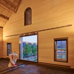 The large portal where grapes were originally hauled up and into the second floor by block and tackle is now an expansive viewing window with sliding glass window, rail or solid pocketing barn door options. When open, western light and a panoramic view of the vineyards stretching across the valley to the mountains fill the room. The new, custom milled tongue and groove wood siding on the interior walls is sized based on dimensions taken from the original, exterior clapboard siding which was salvaged and measured for that purpose. Mechanical systems are hidden in the soffits.