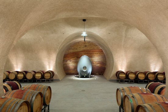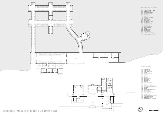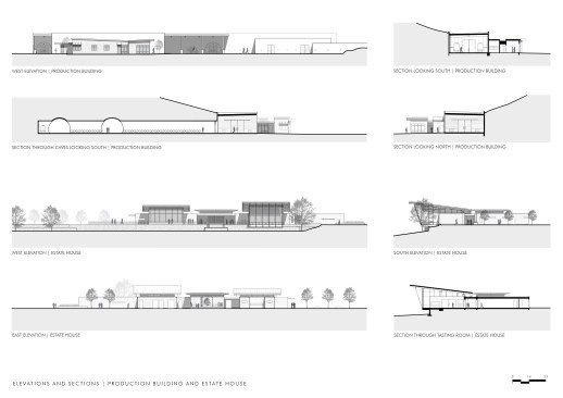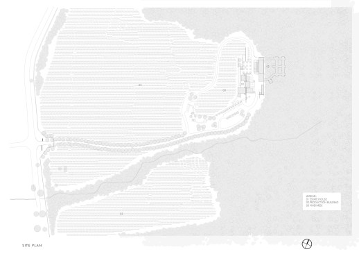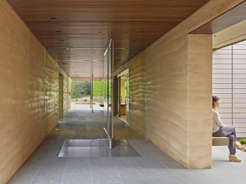 The winery, a pre-engineered steel structure, reinforces the linear process of winemaking, from fruit-in to bottles-out. Tucked into the mountain and with a green roof above, the structure is clad in soil for natural thermal protection. The green roof is pulled back from the perimeter walls allowing natural light to filter in reducing the requirement of artificial lighting. The 25’ PISE wall facing the Estate House is made of the same soil from the site as the rammed-earth walls. The wall also provides a backdrop to the Vintner’s Wing housing the winemaking staff and their support functions.