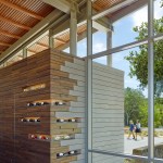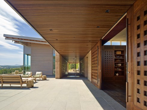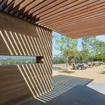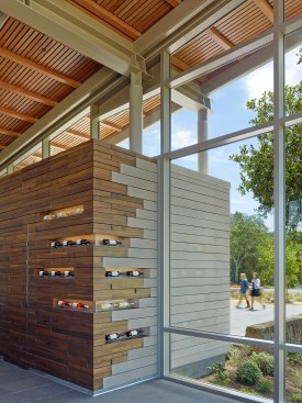 Visitors to Hamel Family Wines are greeted by a stand of hundred-year old olive trees surrounded by gently rolling vineyards. Picturesquely nestled against a slope of oak woodland and manzanita chaparral, the architectural design of the winery takes its inspiration from the natural beauty of the site. The layout of the estate celebrates the expansive views of the Valley’s vineyards from its charming mountainside location, inviting guests to experience the array of indoor and outdoor spaces created for the enjoyment of the wines. The winery’s design showcases fundamental materials of black walnut, travertine, and basalt stone, combined with a pair of rammed-earth walls spanning the length of the Estate House and captures the natural beauty and texture of the surrounding land. Both the Tasting Room and the Library – a private tasting room – incorporate custom cabinetry to display the family’s wines. The ceiling of the Library floats above continuous clerestory windows, allowing the Venetian plaster finish to shimmer in the daylight. The earthen walls organize circulation through the Estate House, linking a series of pavilion-like spaces and providing views all the way through from the entry terrace to a secret “bosque” of white ash trees beyond. Throughout the building, opportunities to experience the inside out, and the outside in, are presented to visitors as they begin their journey from arrival to tasting.