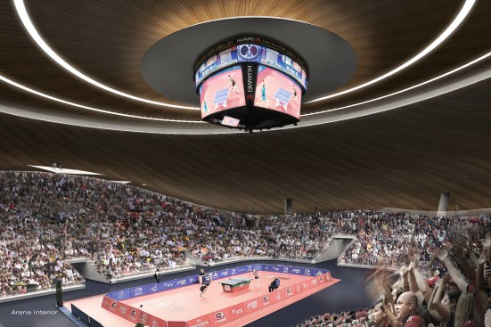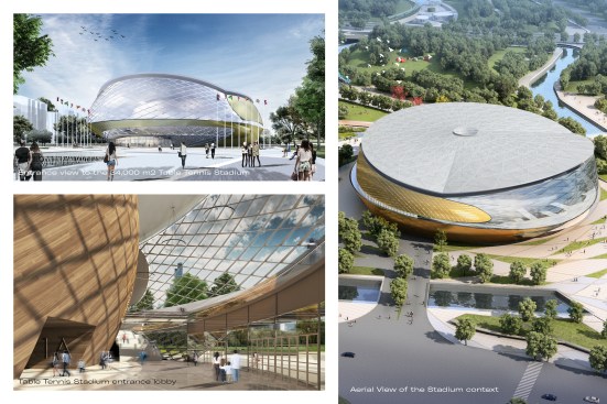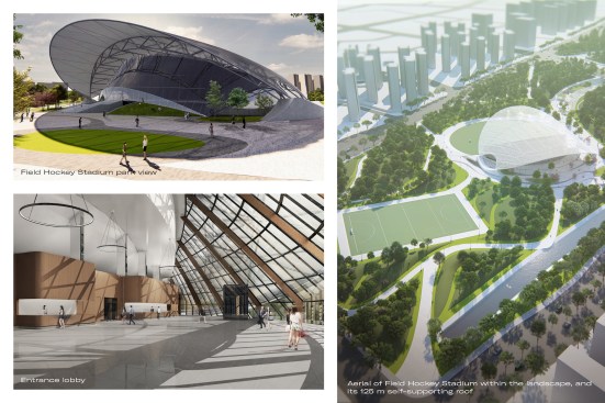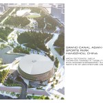 Selected from a group of 5 international architecture firms, Archi-Tectonics won this competition for the 2022 Asian Games with a bold and innovative design, fusing landscape and building programs into a tridimensional land-form. Like pebbles in a river, two iconic stadiums and various other building objects are forming the gravitational nodes in a fluid park landscape for the surrounding city. In collaboration with !Melk landscape design, Mobility in Chain, and Thornton Tomasetti structural engineers, the team created a sustainable, multi-functional 47ha sports park with a table tennis and field hockey stadium, a semi-recessed fitness center and visitor center, a sunken shopping mall, and multiple parking garages, with a total construction area of 188,000 m2.