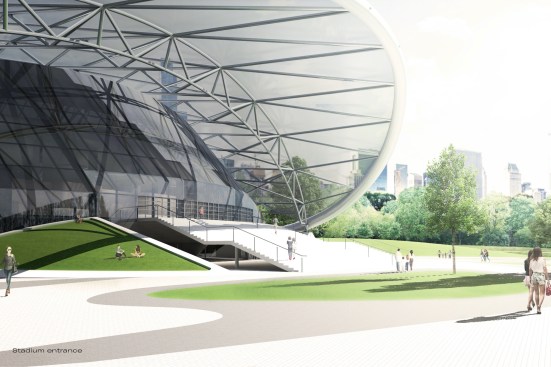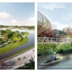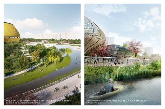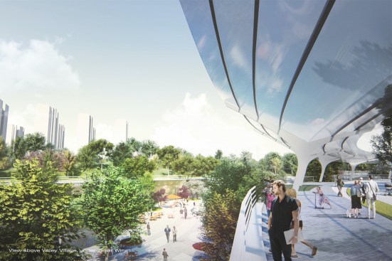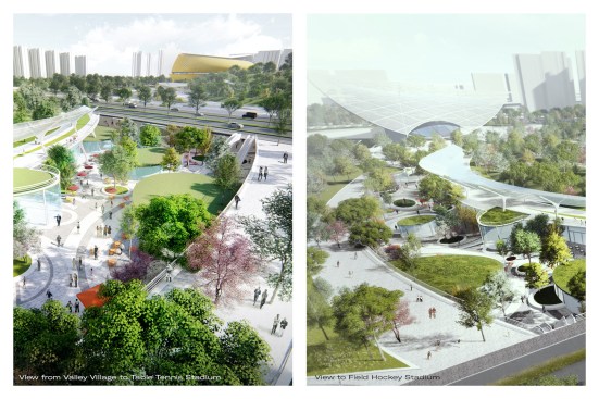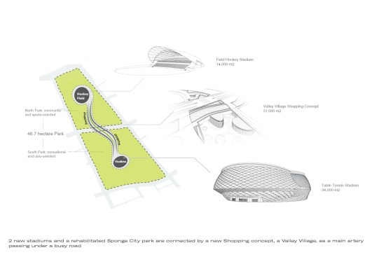 The 47ha landscape park fluidly packs around the buildings as nodes in the landscape. The artificially created hills form a topological fabric for the multitude of programs below and above the ground. The two stadiums, a sunken mall, a fitness center and visitor center, as well as various amenity buildings, will form programmatic and spatial focal points. The stadium structures at both ends of the park are connected by a sunken Valley Village mall, an undulating commercial spine with shops, restaurants, kiosks and underground parking, crossing below the existing Yiyang Road and River. This fluid and natural connection between various programs guarantees not only the seamless circulation during the Asian Games, but also the future success of the project as a lively and active urban space.