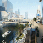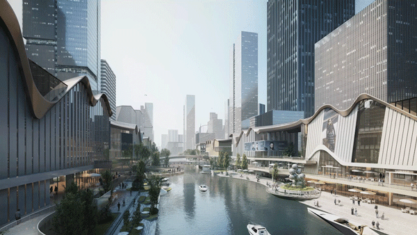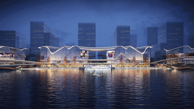 The design also includes elaborate landscape features. Located at the mouth of the river, The Nature Circle connects with and brings in the nature elements from the Qianjiang Century Park. The Lifestyle Circle includes layered hydrophilic platforms where visitors could safely appreciate the waterfront. At the center the animated Art & Literary Circle, along with the spraying fountain draw people from both banks; the Digital Circle echoes the premise of innovation, where drone shows light up the night sky, reflecting the thriving scene of Qianjiang.