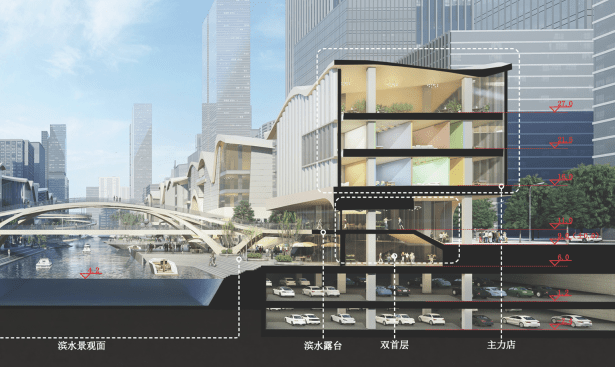 Through double-skin facade, hydrophilic platforms, steps and setbacks, the design blurs boundaries between the architecture and its surroundings, while elevating the space’s commercial value. The added public green area echoes the waterscape and riverside green belt, creating a porous and pleasant waterfront space.