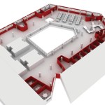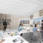Another signature feature is the Radar Desk, a custom-design open-plan work environment fabricated by Columbia Woodworking. Department heads are stationed at this sinuous table, facilitating collaboration. Integral shelving supports the sculptural, laminated-plywood surface.
