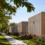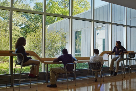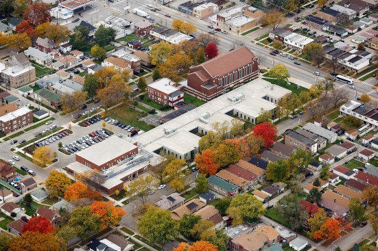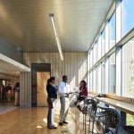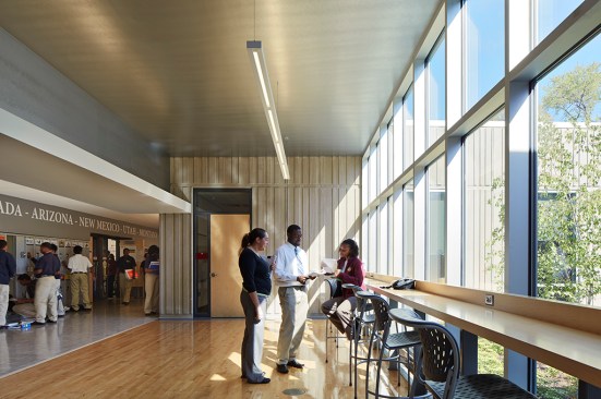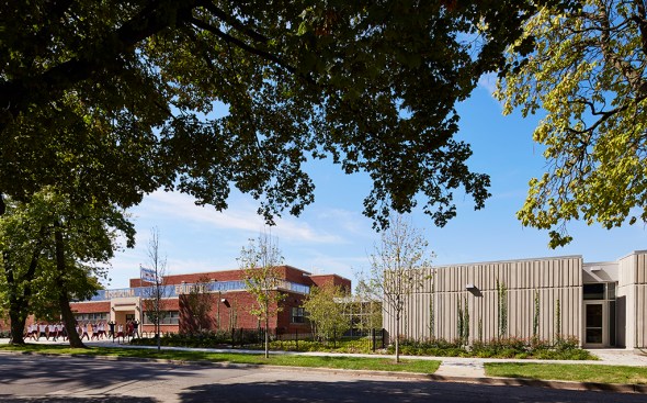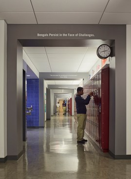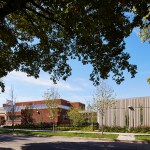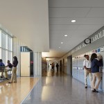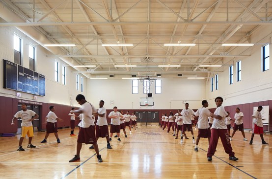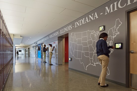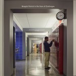 The partnership of a land-rich, resource-poor, existing school facility with a well-capitalized, socially entrepreneurial charter organization results in a low-cost, low-rise structure that showcases landscape, from the interior and exterior, in one of Chicago’s poorest neighborhoods. The new addition to Hansberry College Prep offers a palette of classrooms arranged around rustic courtyards that bring natural light and seasonal color indoors. Design features throughout the building reinforce the school’s goal of preparing students from under-resourced communities to graduate from top colleges and universities. The new facility connects to its South Side neighborhood in several ways. An original two-story gymnasium structure from the defunct parish school, renovated and re-roofed with spray foam insulation for energy efficiency, anchors the new school and offers students and church members a state-of-the-art athletic facility. The precast concrete addition, built to the north of the gymnasium, includes three classroom wings, divided by courtyards that open onto South Aberdeen Street. These courtyards, featuring different species of hardy trees, shrubs, and flowers, offer seasonal color not only to students and faculty but also to residents. Student lockers bear names of prestigious institutions of higher learning instead of numbers. A student assigned to the Princeton locker will learn not only the university’s name and location but also the average academic and extracurricular credentials of admitted first-year students. Similarly, maps along corridor walls display the names of colleges attended by school faculty. Alumni names and college selections will continually enhance this display. Throughout the innovative school design, one message to students is clear: If you identify your goals and work hard to achieve them, you will succeed and that the school and its community believe in their abilities.