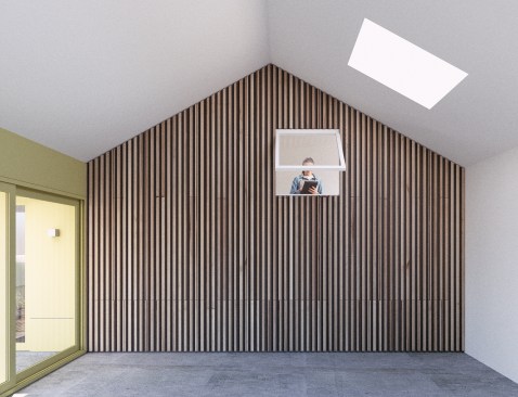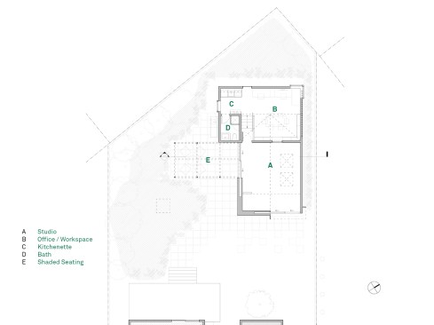 The interior space is delineated with a vertical Red Cedar slat clad wall separating an elevated storage loft and workspace from the “Garage” space. The slatted wall also functions to conceal doors to additional storage below. Skylights are carefully situated to capture soft northern light.