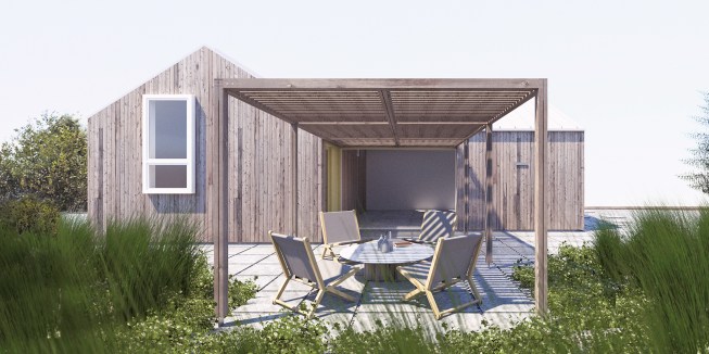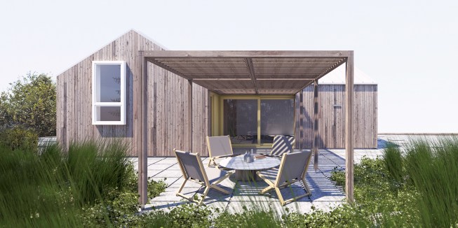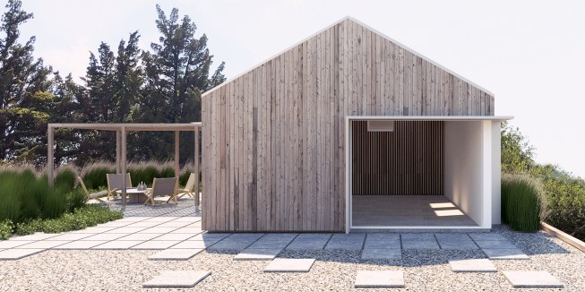 Harbor Pavilion is a small, detached building tucked away on an oversized lot bordering the intracoastal marshlands of New Jersey’s Barnegat Bay. With local building regulations stipulating strict guidelines for accessory buildings within the jurisdiction, the project seeks to challenge the notion of a “Garage” — instead considering the building as a garden pavilion, event space and warm, engaging backdrop for the client’s photography studio.