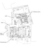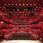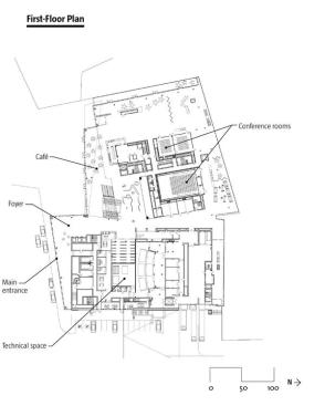 The vibrancy of the glass contraposes the monolithic inner volumes of the four halls, whose perimeter walls are pigmented black concrete, passively conserving warmth from the sun. The interior of the main concert hall, a 1,800-seat auditorium that is home to the Icelandic Opera and the Iceland Symphony Orchestra, is red—echoing the volcanic countryside. Vividly colored glass doors interrupt the serene black surfaces and open to meeting rooms, conference and rehearsal halls, and an exhibition area, where visitors are free to roam. The on-site amenities include shops, a restaurant, a viewing balcony and bar, a ground-floor bistro, and underground parking.