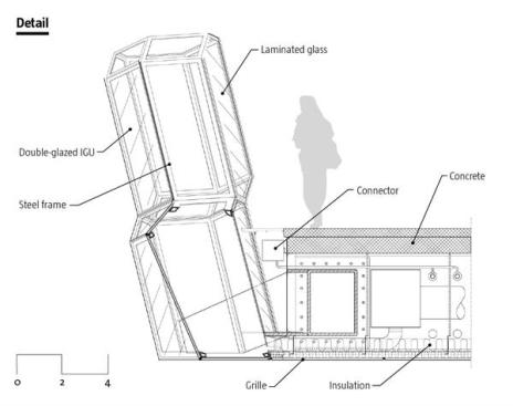 The different types of glass are combined to create the different visual effects in the quasi-bricks of the south façade: For example, the antireflective glass, when paired with a clear glass behind it, creates a clear view line, but when paired with a reflective or dichroic glass, reflects a kaleidoscopic view of the interior. And when two reflective or dichroic glasses are paired on the front and rear of one quasi-brick, it brings the viewer’s attention to the module itself as a defined object in space. The team also considered sun angles, so that a brick that would appear solid in the morning might appear transparent during the course of the day due to the arrangement of reflective glass types. These pairings and groupings are distributed in a painterly fashion across the three-dimensional south façade; the various types of glass are likewise distributed across the two-dimensional north, east, and west façades.