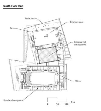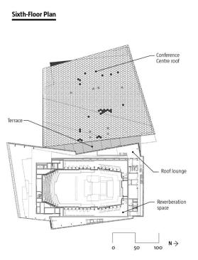 The studies that were carried out by the team on the movement of the sun and the Reykjavik light also influenced the spatial layout of the building inside the skin. The south façade is oriented toward the city, and the various types of clear, reflective, and colored glass employed in the quasi-bricks (see Toolbox, page 120) create a surface that reflects the clouds and sky in a way that turns weather into performance art. Inside the foyer, which runs along the building’s south edge, sunlight filtering through the façade throws light and color onto the floors, balconies, and the polished-steel ceiling.