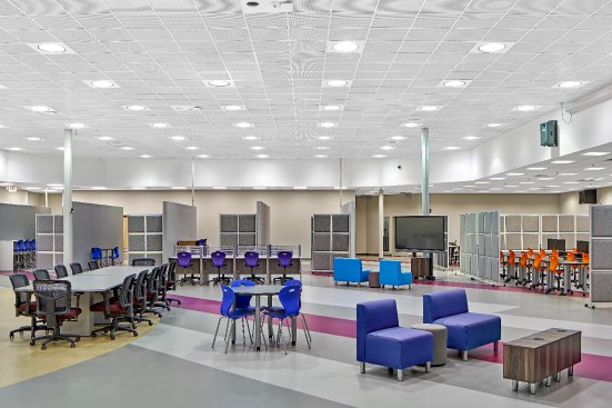 Given the district’s aim to foster interaction amongst students and faculty, our design focused on openness and flexibility. In today’s business environment, open collaborative spaces are the norm; what you work on affects those working with you and around you. The district wanted to reinforce this culture in their space.