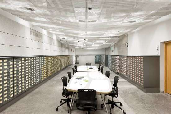 The Media Slide Library project is the relocation of a component of Harvard University’s Fine Arts Library. The project adapts Arthur M. Sackler Museum's former carpentry shop into a highly functional work area and library, supplementing faculty and student's studies with access to photographic and digital imagery. RODE collaborated with Kevin Daly Architects in developing the space and creating a suspended metal ceiling system that transmits an even level of light while shielding extensive overhead utilities.