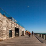 The Pier is an extension of the Promenade from which it projects – a public, open space. The experience of being surrounded by sea and ‘walking on water’ is heightened by the optical game set up by the louvered balustrade design and the quality of the timber deck. This is the first phase for the regeneration of Hastings Pier. Future phases include plans for a large, mobile, timber canopy that traverses the entire length of the 280m pier. In its current format, the new Pier is a catalyst for urban regeneration. It offers flexibility, material and functional sustainability, and an uninterrupted vista of the natural and built surroundings of the special seaside town of Hastings.