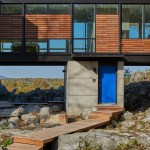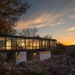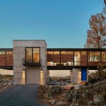 Hawks Nest is a home and studio for a sculptor from Paris who was drawn to the site, an abandoned limestone quarry, with its sweeping views of the Potomac River. Our goal was to create a simple form that was simultaneously separate from and intertwined with nature. Two simple cast concrete volumes rise seamlessly from the limestone creating a framed view of the landscape beyond and a perch for the steel and glass structure above. The grid of steel columns modulates the space and creates framed views of the ever changing play of nature, blurring the line between inside and outside. Ipe, allowed to weather naturally, provides a material counterpoint to the steel and was used on rainscreen walls, on balconies that extend the interior space, and on bridges that leave the site otherwise untouched. The residence is designed to enhance the experience of the nature and inspire the client's work in her ceramic and metal studios. Dark concrete floors with radiant heat provide warmth, while the narrow plan affords natural cross ventilation. The atelier is of the place and, at the same time, provides an armature for a greater appreciation of the natural beauty of the landscape. The raw site presented a major challenge, as the uneven surface was littered with superfluous rocks and boulders discarded from when the quarry was active. In addition, the foundation design had to contend with sub surface caves, active springs, and "fractures." The site was disturbed as little as possible, by supporting the concrete volumes on pilings of varying depths; the concrete walls that span between pilings sit directly on bedrock. Boulders that were scattered about the site were left in place and the native vegetation is allowed to grow and return the surrounding landscape to its natural setting.