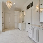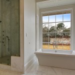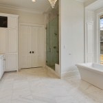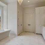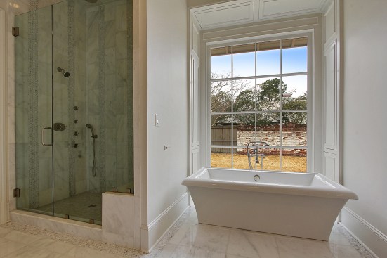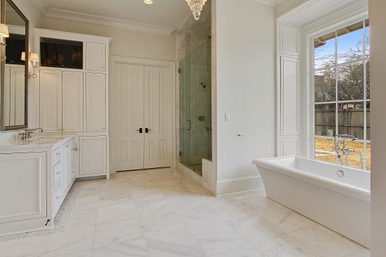 The master suite was a major planning objective during the design process. The floor to ceiling window and tub were designed to be the focal point of the room. 18×18 carrera marble floors were installed with a 6” hexagonal Carrera marble border. The shower includes floor to ceiling 9×18 carrera marble, with 4” white hexagonal Carrera marble accent strips. Custom cabinets were installed with Calcutta gold countertops. Along with window and tub, this space was designed around the 100 year old crystal chandelier. Custom wood paneling was installed around the tub not only for looks but also for storage. Each individual panel pushes in to open up for storage.