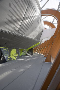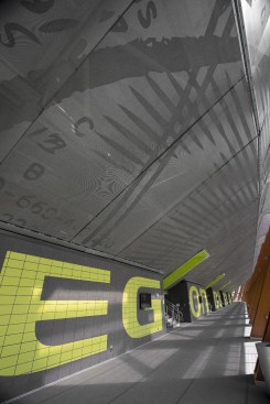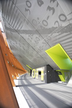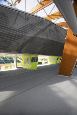 SRG found GKD Metal Fabric could satisfy the exacting technical and aesthetic requirements for the Hayward Field project. The product was a great opportunity to do something different and innovative and also offered branding opportunity to pay homage to the former stadium’s rich history, says Figueroa. “The advantage of using this mesh is being able to slightly torsion and torque it, to make it become a continuous canvas on the underside of the bowl, which also allowed for graphics and branding.”