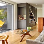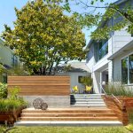 This 1950’s house was long in need of an upgrade and expansion to capitalize on otherwise ‘good bones’ and to satisfy the needs of a family with young children. A kitchen remodel (completed 2012) was the first problem to tackle. At that time the foundation work for the future upstairs addition was also put in place, so that the second level master bedroom addition (completed 2018) would proceed more smoothly. The organizing element to the plan is the stair, which replaces storage and mechanical closets, and otherwise opens up a previously narrow and dark hallway. Combining storage, access, craftsmanship, materiality, a bar, transparency, and daylighting from above, the attitude towards the stair nodule combines many features that carry through the project. Another unifying concept to the project was to use the yard to greater effect. This meant adding flush sliders to the family room/kitchen blurring the line between indoor and outdoor space. Basalt paving in the yard transitions to wide wood and concrete steps providing spectator seating when the kids perform on the lawn. An exuberant magnolia gives the new upstairs master bedroom a tree-house feel with fullwall sliding windows that have an ‘invisible’ glass safety rail. Direct western light and glare are controlled by exterior shades and deep overhangs. This new second level 700 s.f. addition integrates with the humble wood siding/composition shingle exterior of the original house, yet is set apart as it is clad with a state of the art rainscreen wall featuring cementitious panel siding