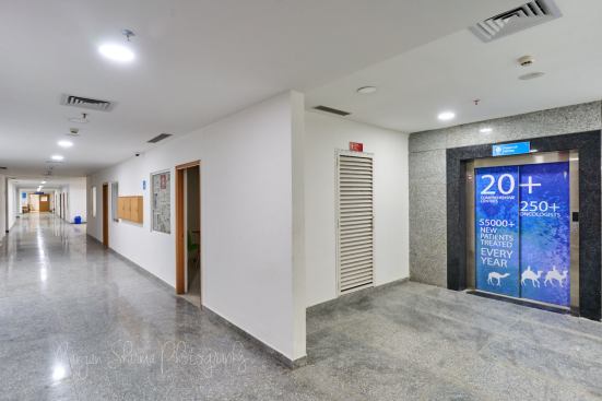 The first floor is equipped with the blood bank and laboratories in the left wing. The existing block houses all the operation theaters. All the Intensive Care Units are placed on the rear wing and in one half of the right wing. The remaining half of the right wing houses all the catheterization labs. The second floor of the left wing houses the Pediatric ICU as well as the High Dependency Units, while the right wing houses the Delivery suites and the In-Vitro Fertilization units. Neonatal Intensive Care Units are placed on the second floor of the central wing and Administration departments and general departments are planned on the third floor. The Bone Marrow Transplantation ward has been planned in the left wing of the fourth floor while the other two wings accommodate the private and semi-private rooms. Patient suites, private and semi-private suites are all located on the fifth floor. The basement houses parking, service facilities, linear accelerators and bio-medical (hazardous and non-hazardous) waste storage facility.
