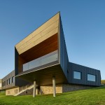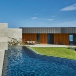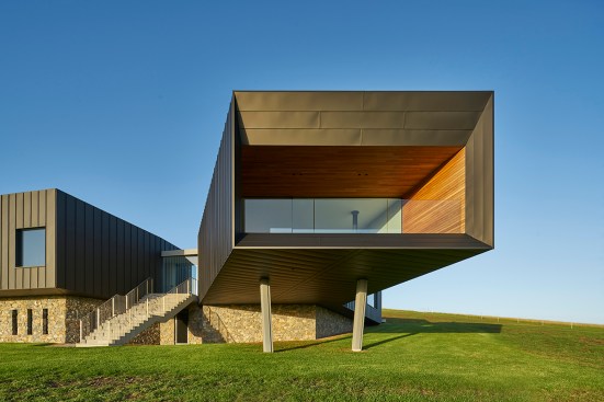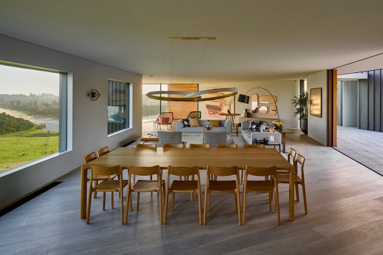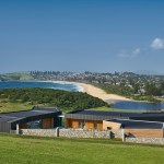 This new home designed by Atelier Andy Carson is a sanctuary from its harsh surrounds, perched on a sprawling coastal site at Werri Beach, New South Wales. Green pastures and paddocks running dairy cows line this 150-acre property on one side, rugged coastal cliffs and ocean on the other.
