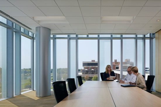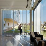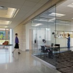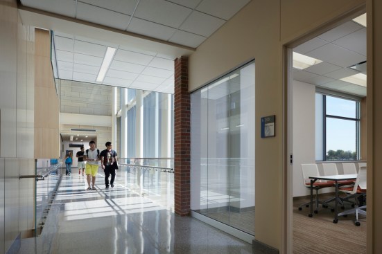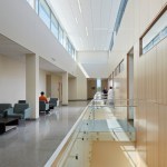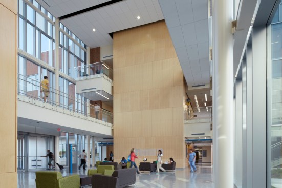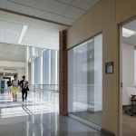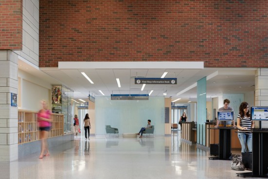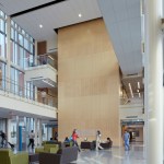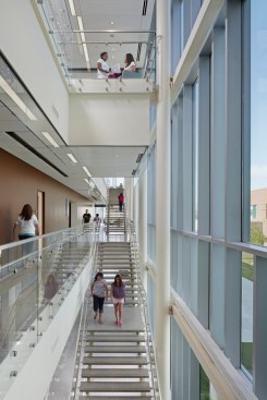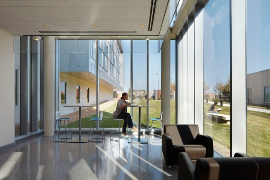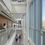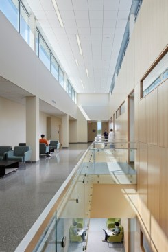 Communal spaces and conference rooms were designed for students, staff and alumni to use for collaboration and networking and to foster a sense of community. Standing as a vibrant beacon on the campus, the atrium serves as a gathering space for students from all health career programs at the college.