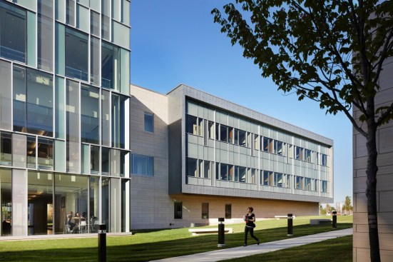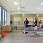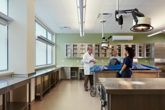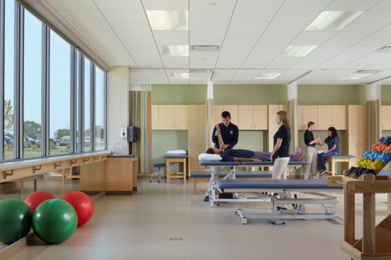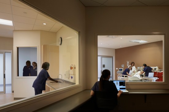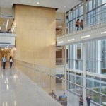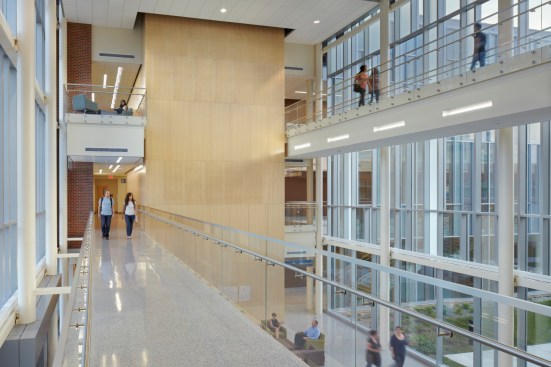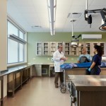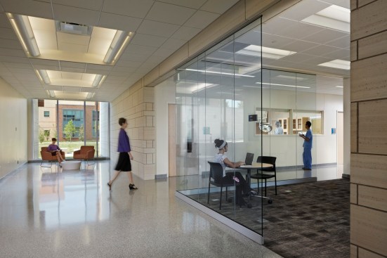 The 135,000-square-foot building’s learning spaces were designed to offer experiential educational opportunities and include laboratories, computer labs, simulation classrooms and problem-based learning rooms. The Health and Life Sciences Building has the look and feel of a real hospital, where students can practice everything from transporting a patient on a gurney via large service elevators to situating patients under non-energized x-ray machines.