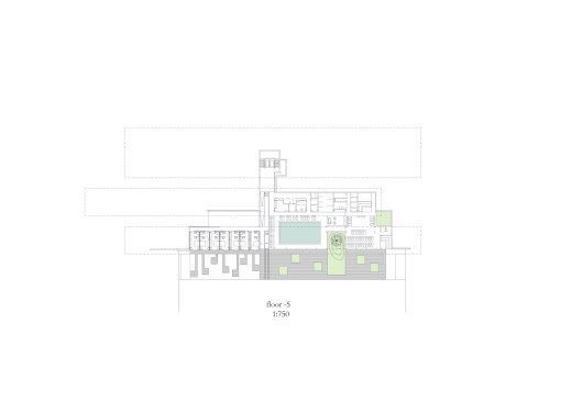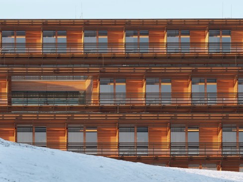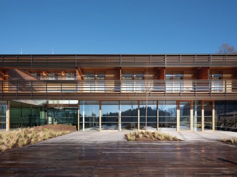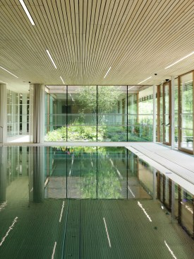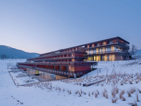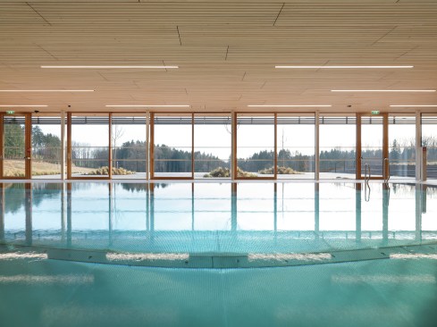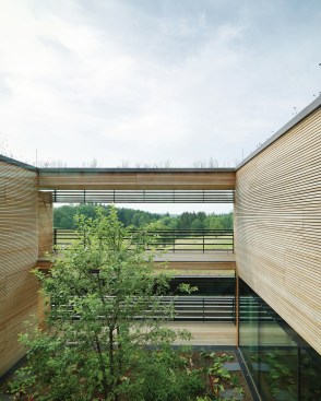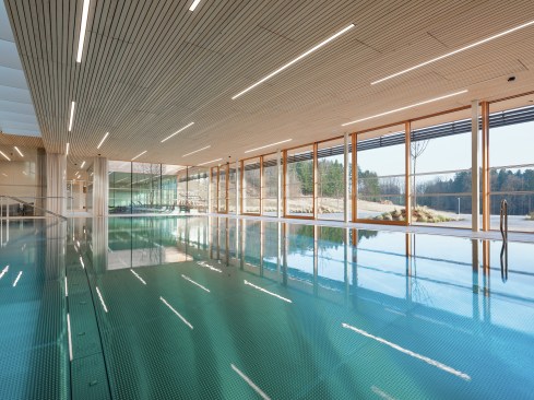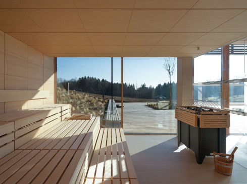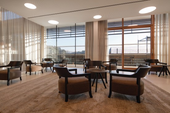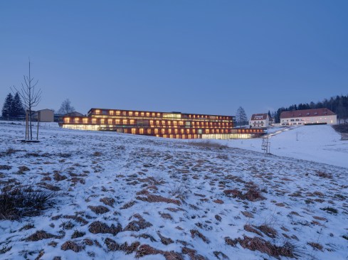 The load-bearing structure of the building is reduced to an economical and highly economic way of building, which allows for a very high degree of prefabrication. The rooms are made of timber modules and are delivered to the construction site with completed interiors. The atmosphere in the rooms is dominated by natural materials and underlines the mission of the facility as a health center. The landscape flowing through the buildings is also complemented by natural materials.