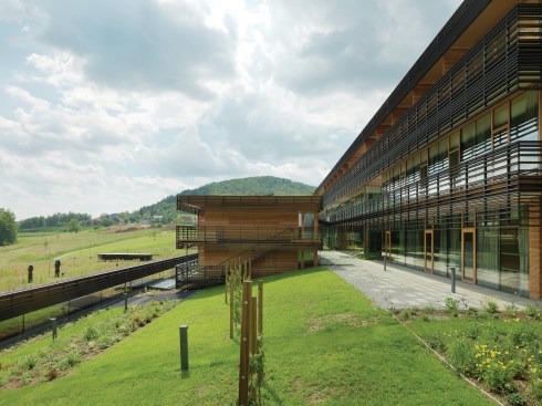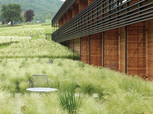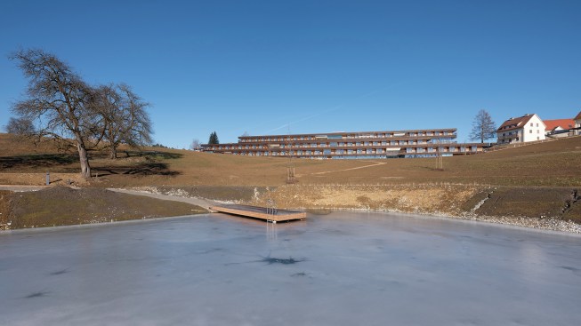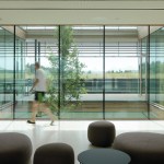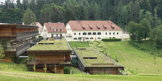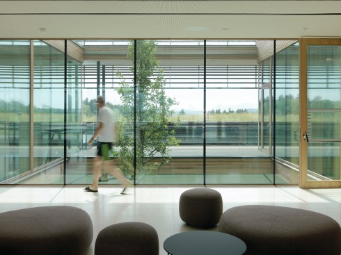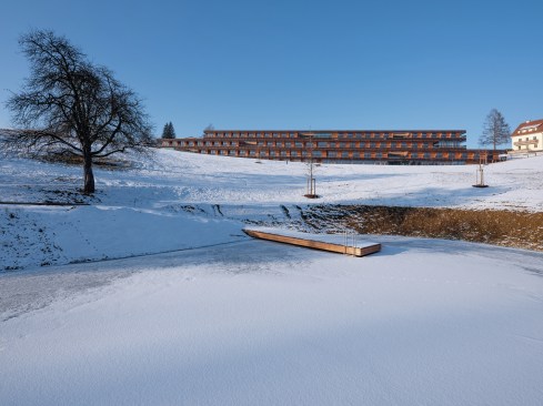 Three narrow, elongated structures are set into the arena-like topography in such a way that the buildings sometimes appear to hover over or be embedded into the terrain. The landscape flows through the building. Atria reflecting the planted orchard meadow underline this creative objective.