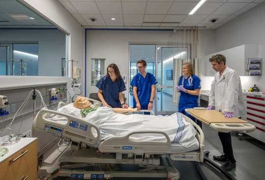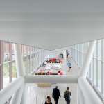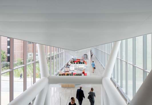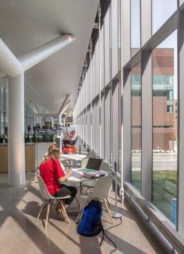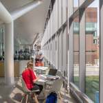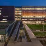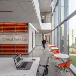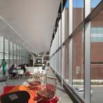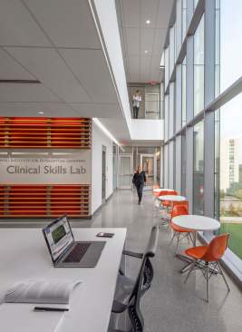 The KUMC Health Education Building is an inter-professional academic facility serving the schools of medicine, nursing, and health professions. The program is a blend of traditional and emerging learning spaces that support active, team-based learning, from learning studios to clinical skills and simulation laboratories. The design creates an iconic presence with a four-story glass “lantern” box that places the project program on public display. Existing clinical, research and education buildings surround the site. HEB acts as a connector, linking the neighboring buildings with a 250-foot enclosed bridge that passes directly through the new facility. The bridge features 6,000 square feet of student life space spanning 39th Street at the intersection of campus life. CO Architects: Design Architect; Helix: Executive Architect.