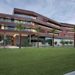 The 268,000-GSF building is highly sustainable; the exterior cladding – native Arizona copper – is designed as an insulating layer that floats in front of the exterior skin to provide protection from the desert sun by stack effect. Inspired by the region’s iconic canyon formations, the copper panels are engineered with a series of intricate, irregular folds that reinterpret the stratified earth rock formations of the surrounding desert canyons.