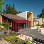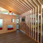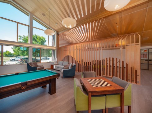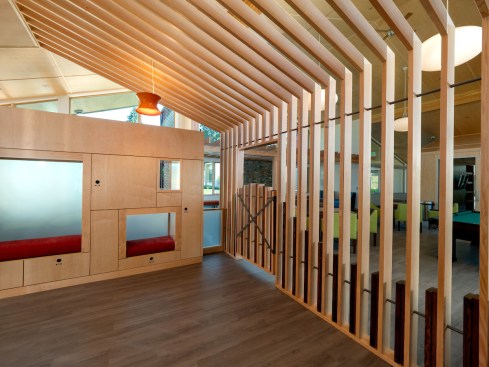 The architects focused on establishing a strong sense of “home” to create a comforting place of meaningful refuge through thoughtful material selection and spatial composition. Elements with a classically residential vocabulary: window seats, dormer windows, and trellises are re-imagined throughout the project with a contemporary twist. Slat walls combined with large expanses of glass and whimsical pendants create a striking interplay of light and shadow; bringing an unexpected playfulness to the spaces.
