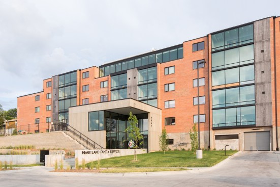 Heartland Family Works offers four- and six-month residential substance abuse treatment programs in a setting that keeps families intact while giving mothers the intensive, professional support they need to get clean and stay sober. The program also aids in obtaining vocational training, employment, and other social services. Tasked with being good stewards of the client’s resources, and met with the challenge of bringing new life to an existing concrete shell, the design team turned to modernist principles, using the contrast of warm colors and textures to complement the cool palate of the concrete. The result is a space with a residential feel that is timeless and durable, and a hopeful place of healing for the families who live there.