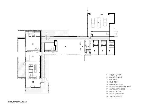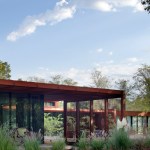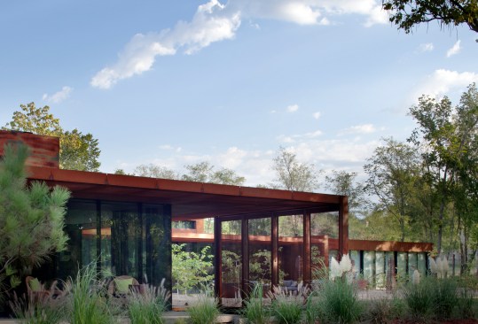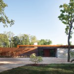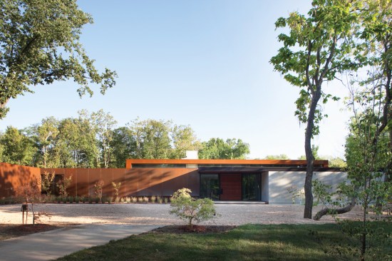 Aptly named, Heavy Metal is a steel-clad private residence sited on eight acres of heavily wooded terrain. The client owns a steel manufacturing facility, and he wished to have his home reflect both his family business and his personal artistic background. These desires became a critical component for the layout of the home. The residence was designed to be a single-level, gallery-like space in which the client could move easily—from home, to office, to studio—with strong connections to nature from each space.The perforation system was designed to accommodate sun shading, transparency, and privacy needs. The strategic layering of glass and perforated steel shades the interior of the home and provides views of landscape around it.