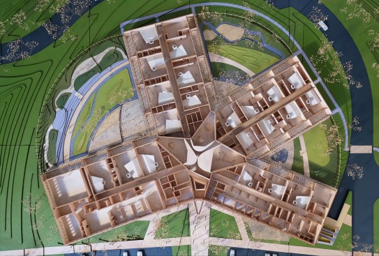 How can a single building have a significant impact on the quality of early childhood health in Arkansas: A state that ranks near the bottom in terms key indicators of childhood health? As 90% of a person’s intellect, personality and social skills are developed by age 5, how can the architecture and landscape of a facility contribute positively to the early childhood experience that is so critical for children’s brain development and future success? This project aims to do just that, by setting an example for what a well-designed early childhood education center, by integrating interior and exterior space. In addition, it gives prominence to the Early Childhood Initiatives Center, a facility dedicated to elevating the quality of early childhood education throughout the region by offering access to training programs, with the goal of raising the certification level of all centers that focus on young children. This 45,000 sq.ft. early childhood education center one of the inaugural Northwest Arkansas Design Excellence projects. This program pre-qualified 32 firms from around the world who met the high standard of design excellence, to “promotes the highest level of design in the development of future public buildings and spaces in Arkansas’ Benton and Washington counties. The program is intended to elevate the quality of architectural and landscape design in the Northwest Arkansas region.” The design for this important structure, that combines the Helen R. Walton Children’s Enrichment Center (HWCEC) and the Early Childhood Initiatives Center (ECIC), provides a natural place that inspires children at the critical early years of their development. The design looks to turn the building into a structure that both provides a home for childhood development and learning, and an opportunity to learn from the building about the place in which we live. The 45,000 square foot building is nestled into the open site on J-Street, near the heart of downtown Bentonville, creating a structure that is inviting and integrated into the natural site. A circular driveway around the building gives a gracious entrance to the center, offering a quiet moment of transition each day for parents and children as they make their way to the entrance on the north. The main entrance faces the entrance to Crystal Bridges, with the parking integrated into planting and bio swales to nestle the structure into its site and community.