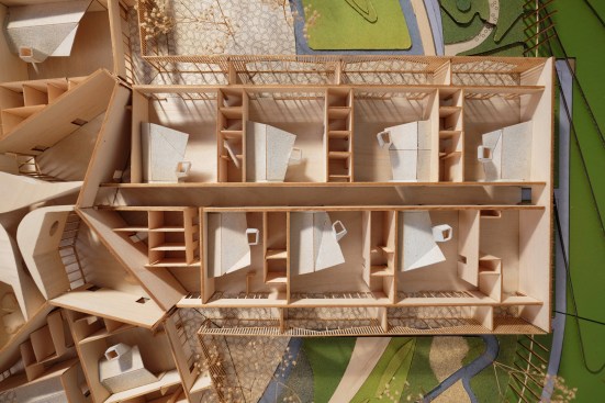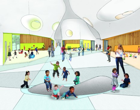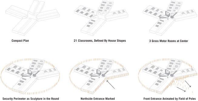 The interior spaces themselves are configured as individual “houses,” each with a faintly gabled ceiling and a “chimney” aperture that functions as a skylight. At the building’s heart, three classrooms devoted to gross motor skills are shaped by complex warping walls, the building’s spokes colliding in the middle to intricate spatial effect.