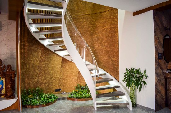 Helical staircases are fabricated to have the appearance of a curve or helix. This curved structure leads you from one level to the next by way of a flowing circular rotation. Because of its unique shape and rising characteristic, this type of staircase is ideal for retail, showrooms and atriums of public spaces.