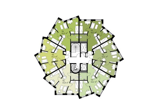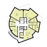 In all, the house holds 69 apartments, all but one configured for two students sharing kitchen, bathroom and a small living room while having a private bedroom.